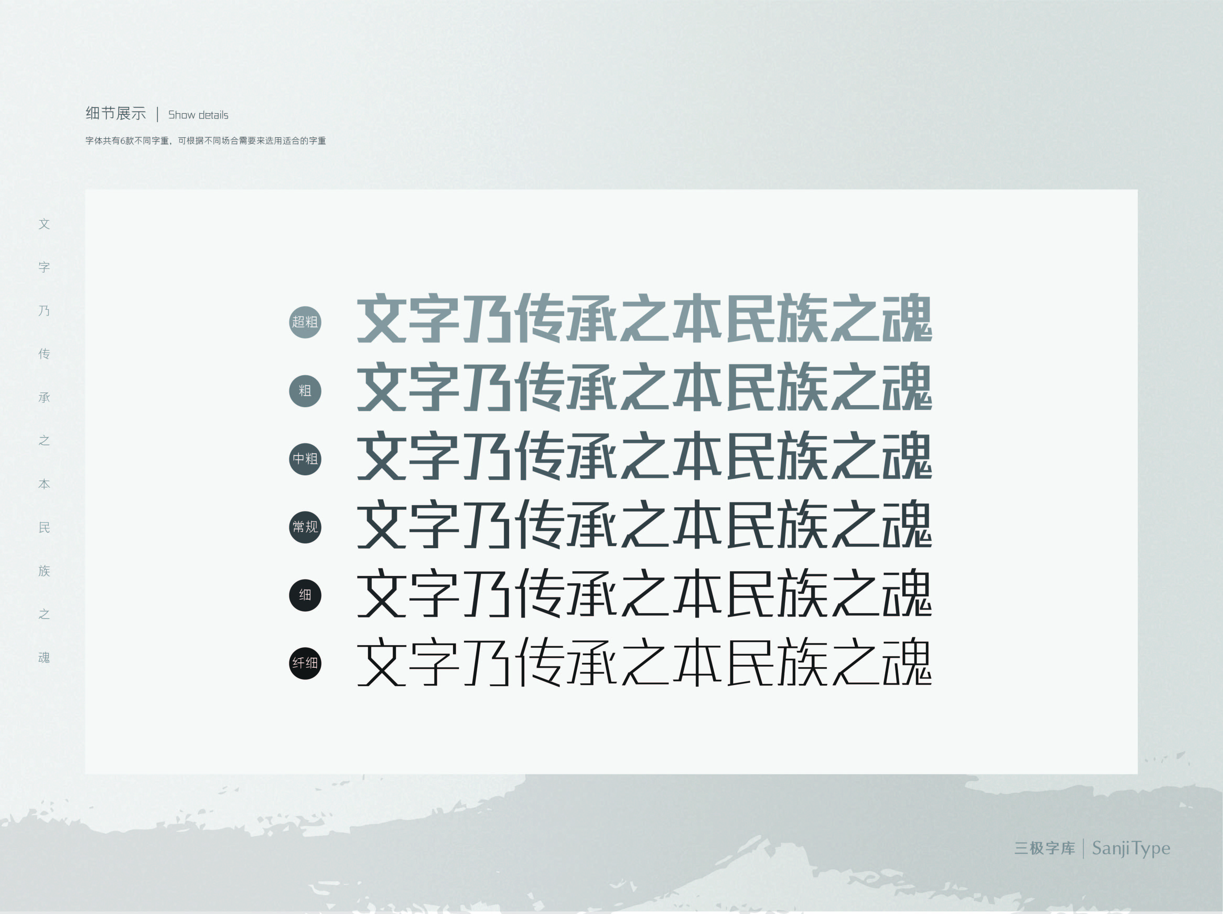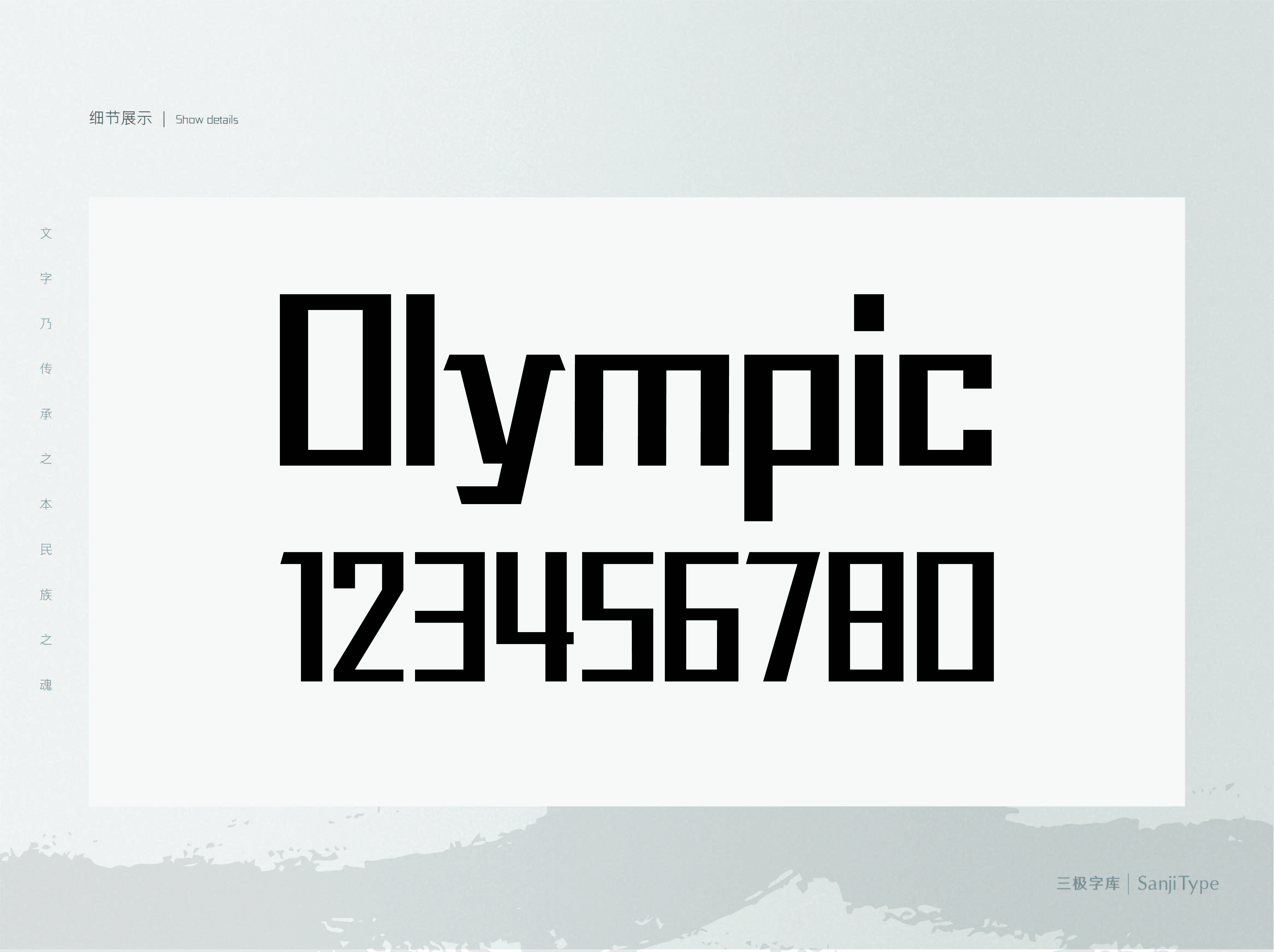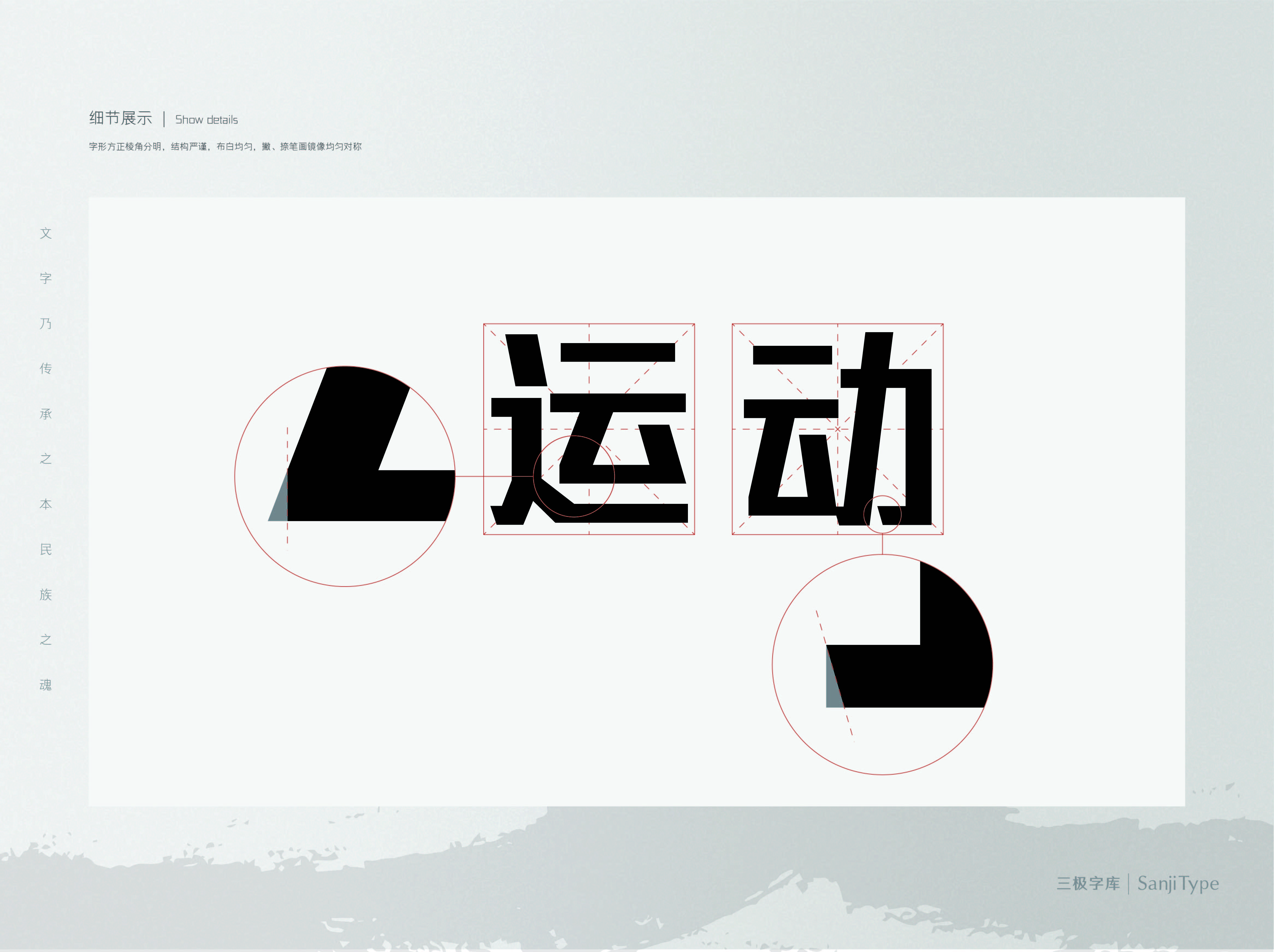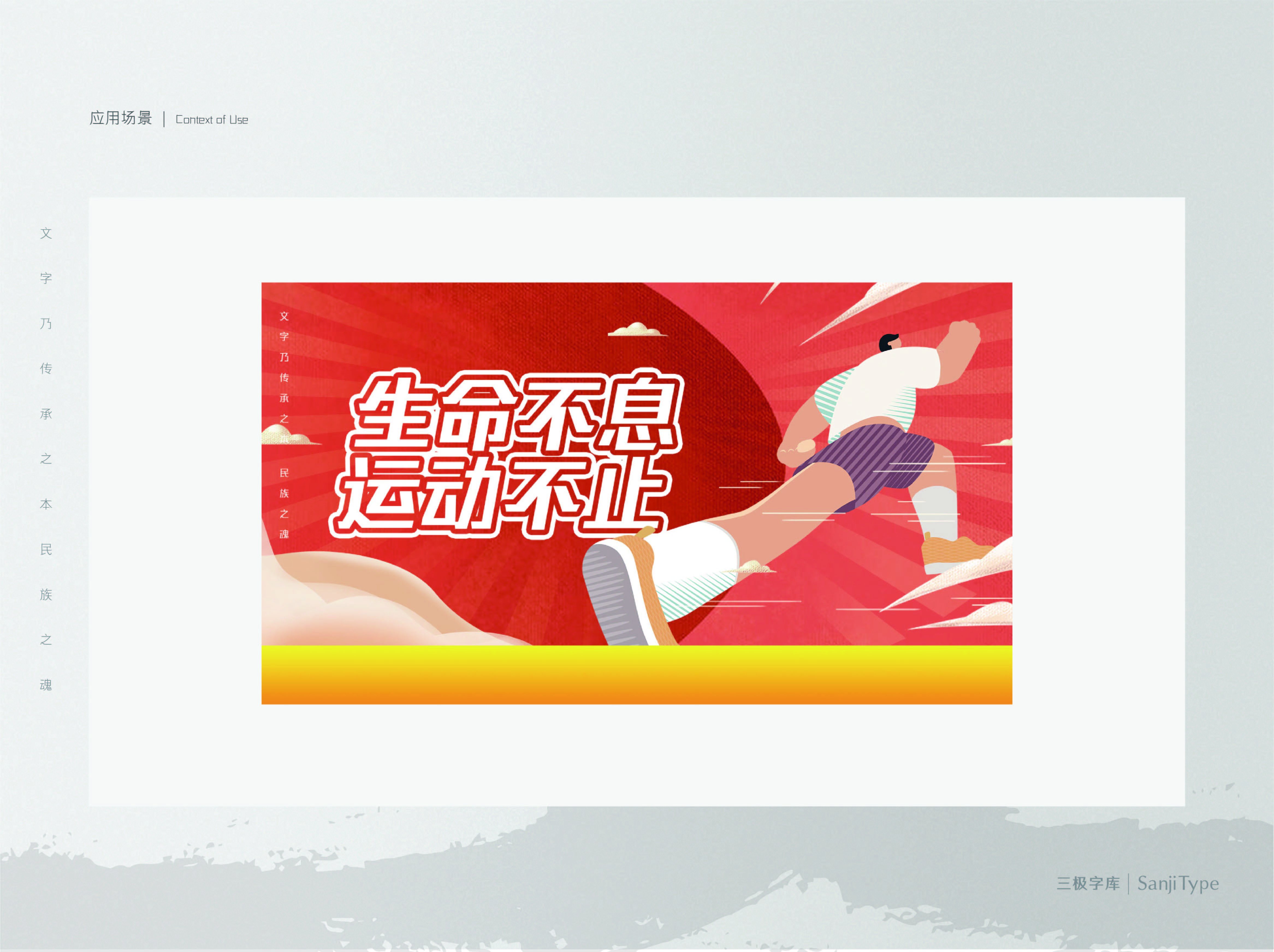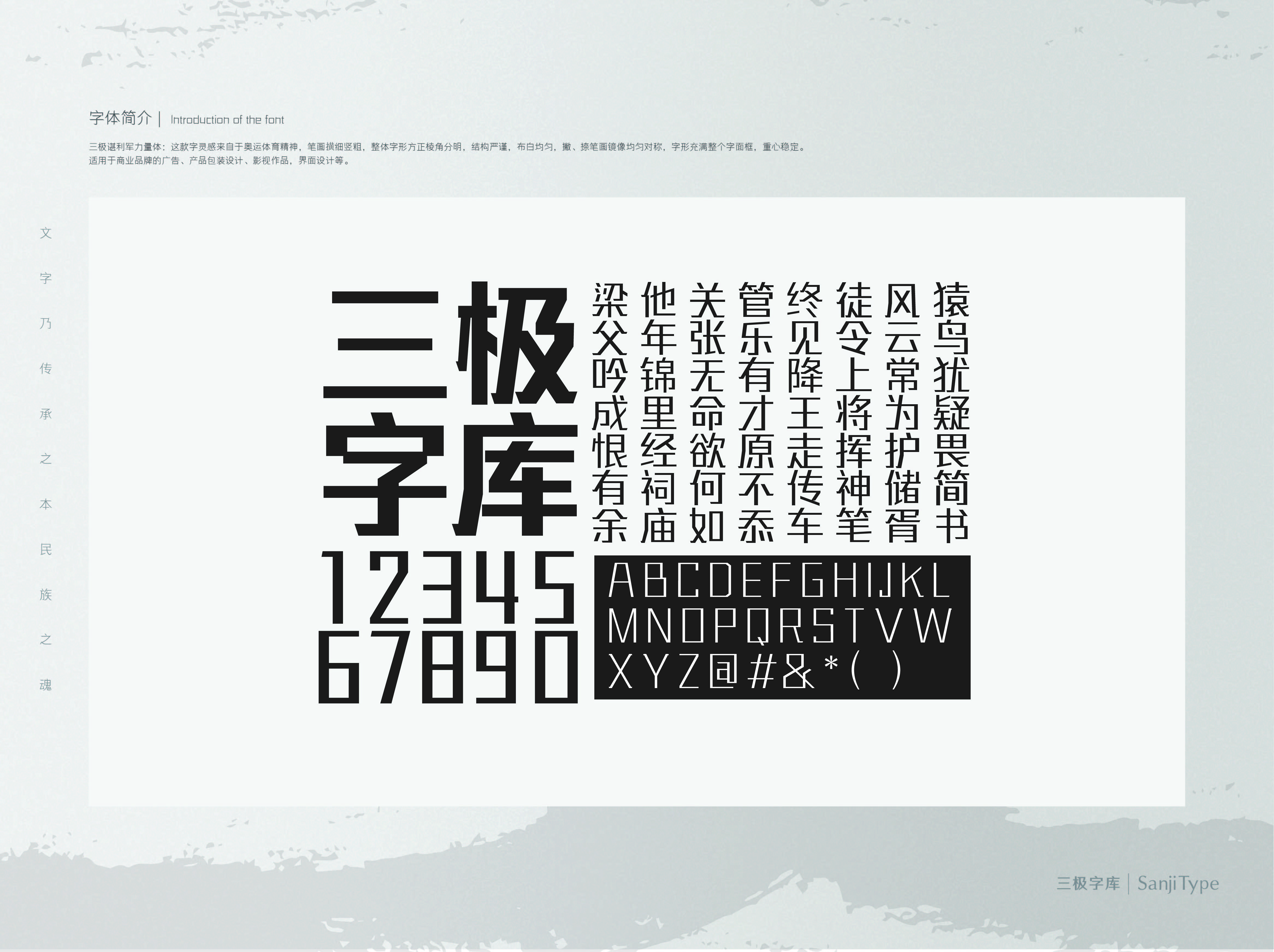 创作灵感来自于奥运体育精神,整体充满稳定感和力量感。字形方正棱角分明,结构严谨,重心稳定,布白均匀。撇、捺笔画镜像对称,字形充满整个字面框。三极谌利军力量体适用于商业品牌的广告、产品包装设计、影视作品,界面设计等,能够为画面增强力量感。