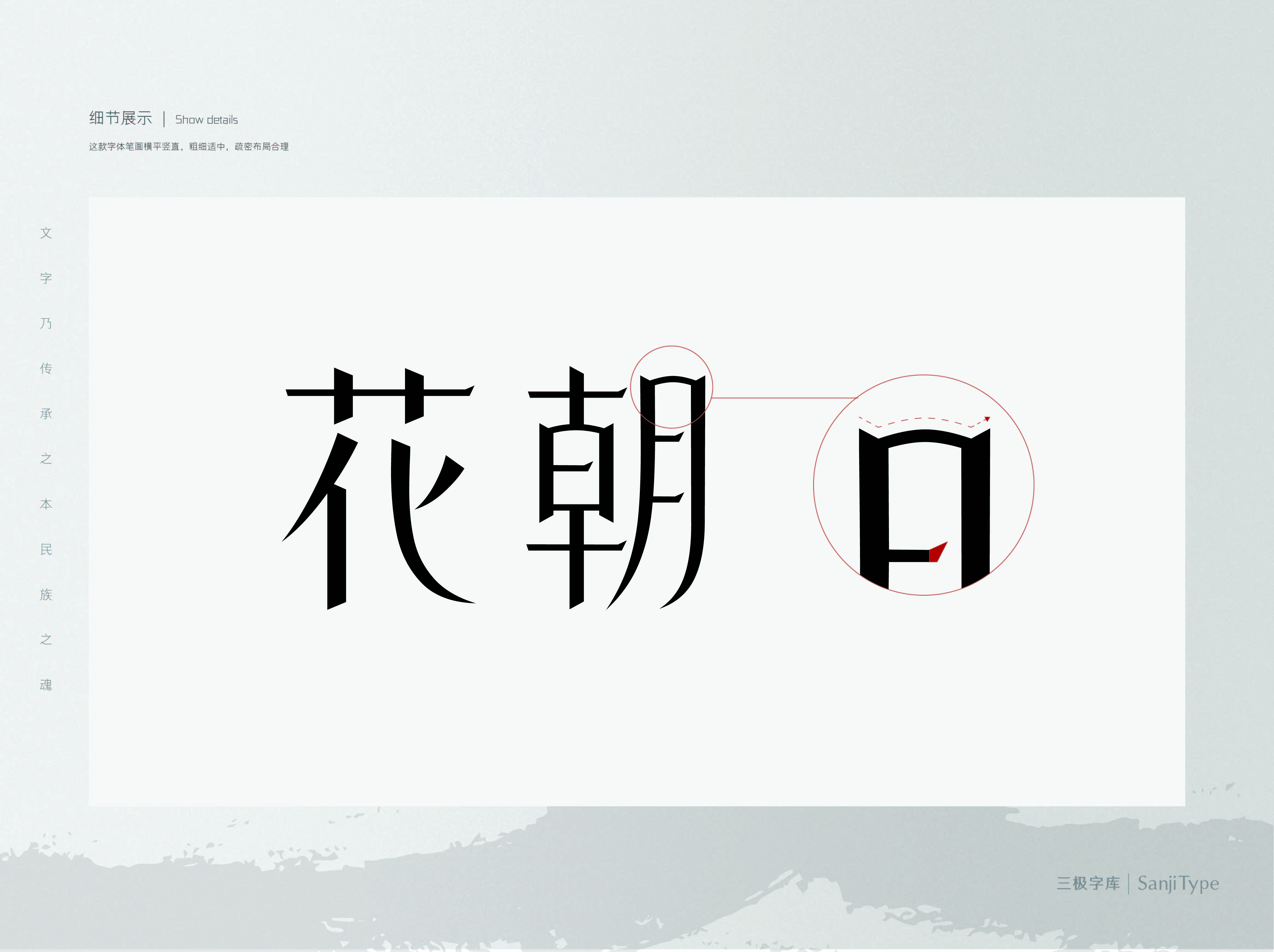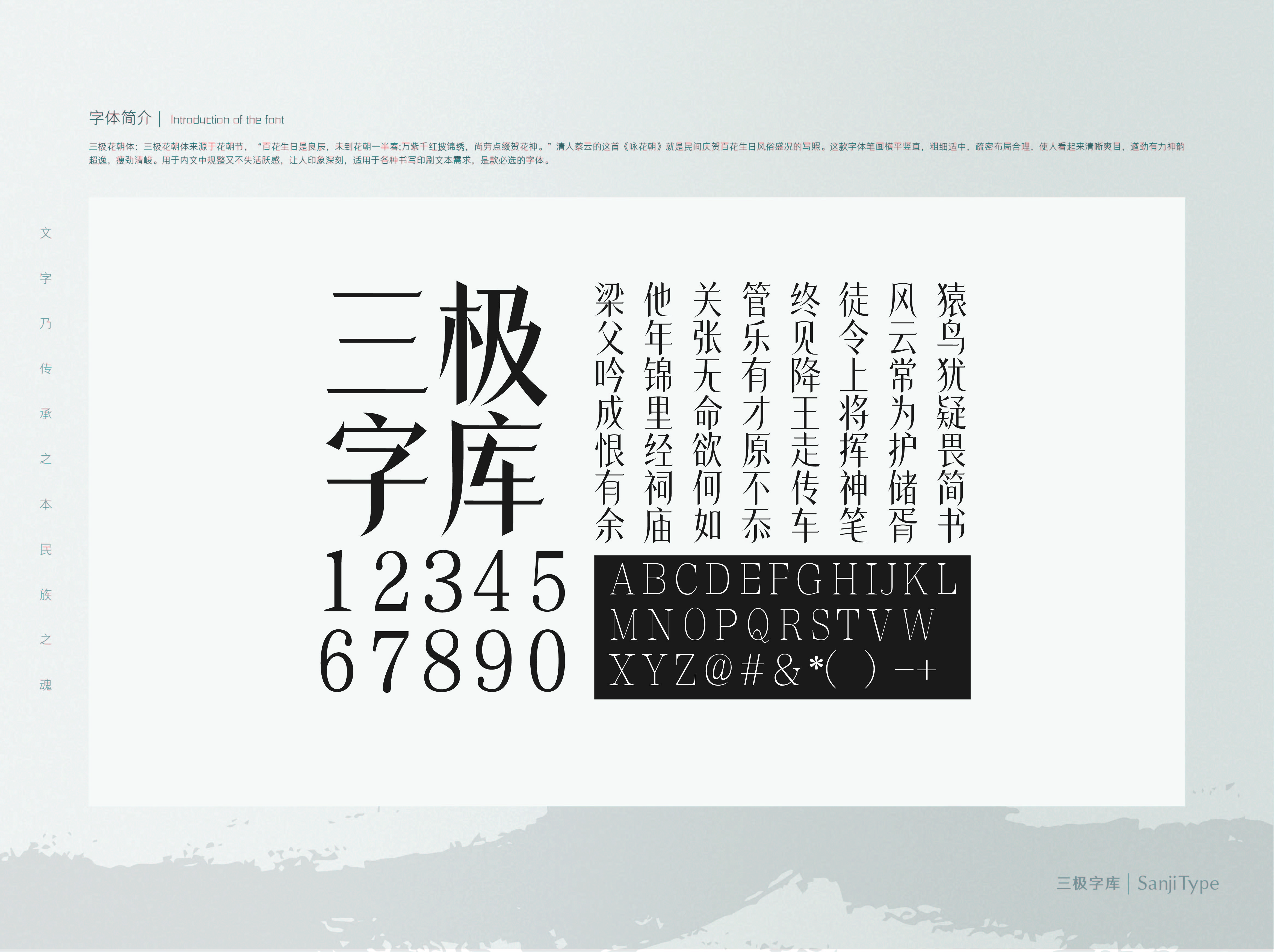 三极花朝体创意来源于中国传统节日——花朝节,指中国百花的生日。这款字体在横平竖直的笔画中加入弧度,彰显出复古优雅的传统韵味。粗细适中,疏密布局合理,清晰爽目,遒劲有力神韵超逸。用于内文中规整又不失活跃感,让人印象深刻,适用于各种书写印刷文本需求,是款审美价值与实用价值兼备的字体。