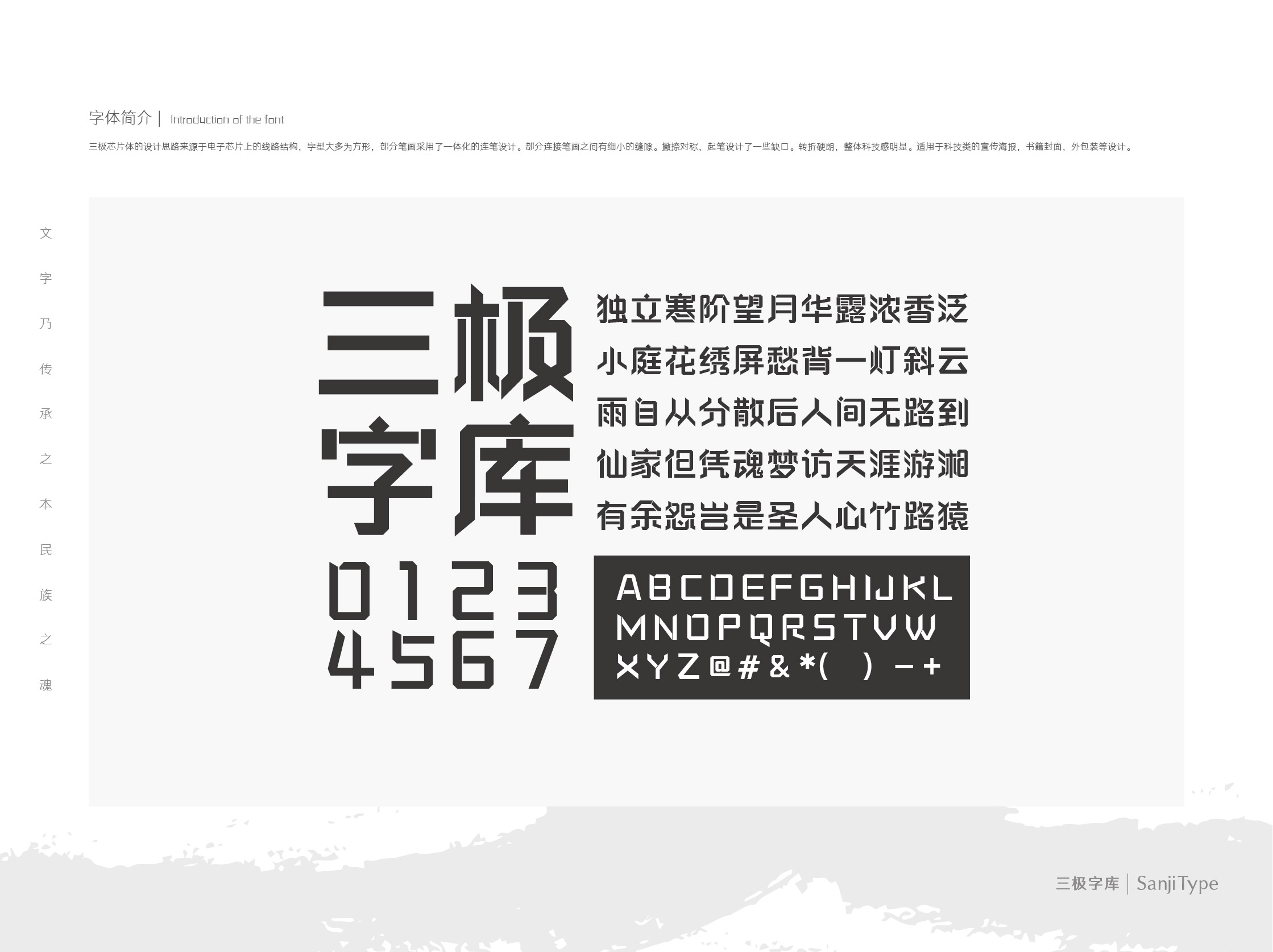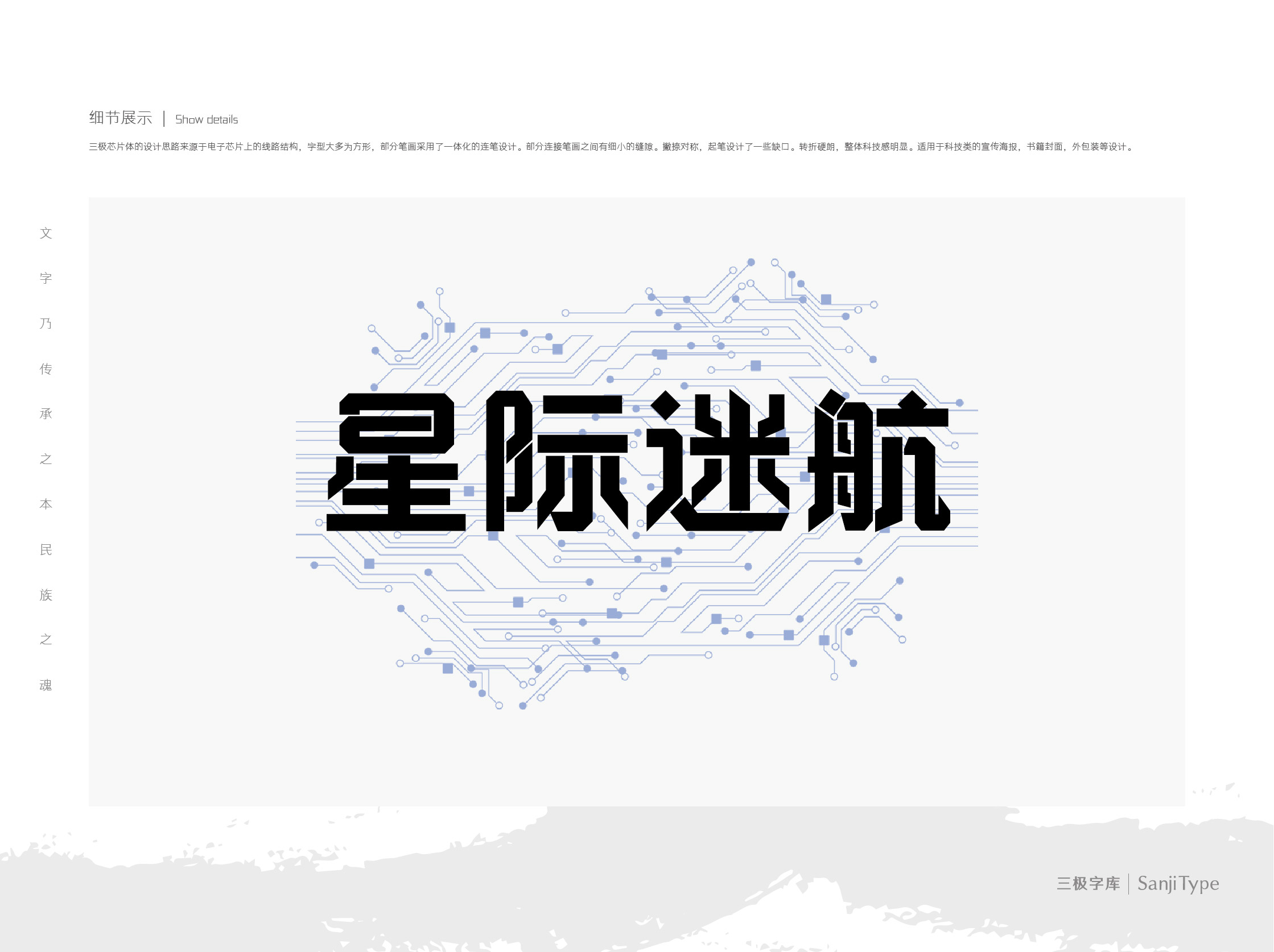 三极芯片体的设计思路来源于电子芯片上的线路结构,字型大多为方形,部分笔画采用了一体化的连笔设计。部分连接笔画之间有细小的缝隙。撇捺对称,起笔设计了一些缺口。转折硬朗,整体科技感明显。适用于科技类的宣传海报,书籍封面,外包装等设计。